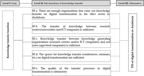 - Level I: It corresponds to the overall objective of the model. In this case, to evaluate the performance of the KT function of the SIT of the DT in the Andalusian olive landscape.