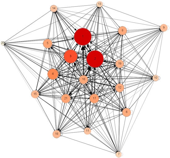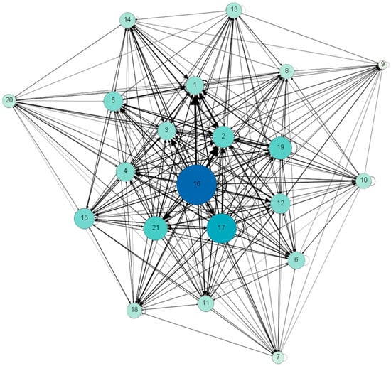 The KT network of the DT in the olive landscape in Andalusia is composed of the 21 actors previously identified and 439 connections established between them. A first analysis focuses on the ‘global’ network which is based on the accumulated links, regardless of their quality (i.e., type and intensity of connections) (Figure 2 and Figure 3). The density of the network is 1, indicating that all actors are connected to each other. Moreover, it is a complete network as no actor is disconnected. In terms of centralisation, it should be noted that there is no single central actor, but rather a set of actors at the centre of the network, forming a decentralised network, indicating that decision-making is substantially distributed throughout the KT network. This finding is in line with the literature in that networks are centralised in their initial phase, and later in the knowledge diffusion phase, they become decentralised as part of their functioning [].