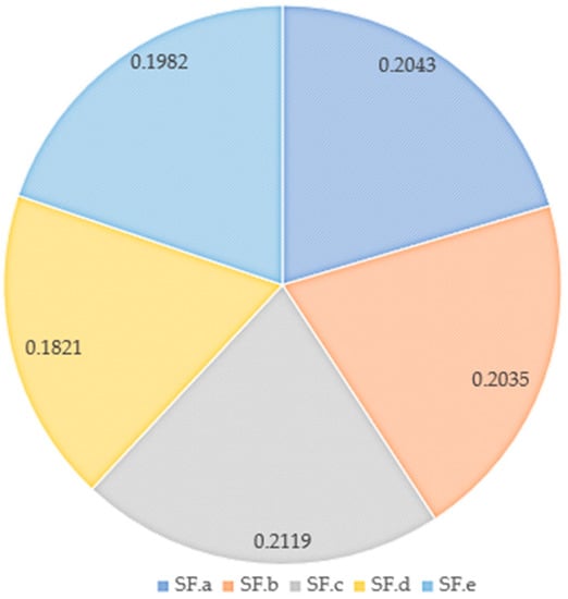 Subsequently, the priority of the alternative must be synthesised in terms of its satisfaction with the overall objective. It can be calculated by the weighted sum of the local priorities of the sub-functions with respect to the overall objective and the local priorities of the alternative in the sub-functions [], already aggregated for the group. The global priority of the alternative can vary between 0 and 1.