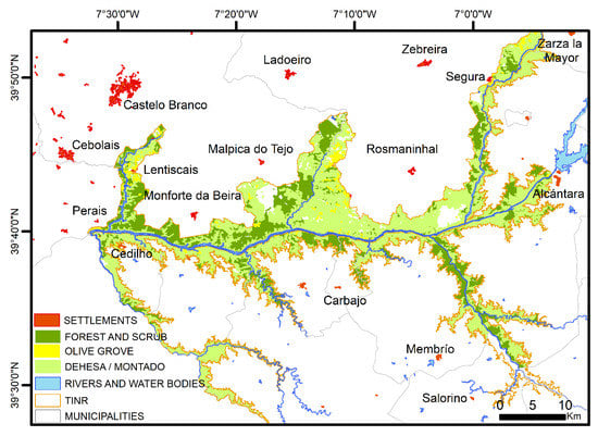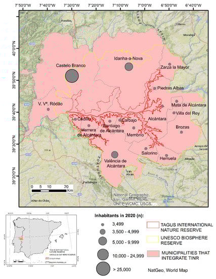 The study area is delimited by the cross-border municipalities that integrate the Tagus International Nature Reserve (TINR) area, which integrate the NUTS II Centro (Portugal) and Extremadura (Spain). The TINR extends over an area of approximately 516 km2, which corresponds to 10% of the municipalities’ total area.