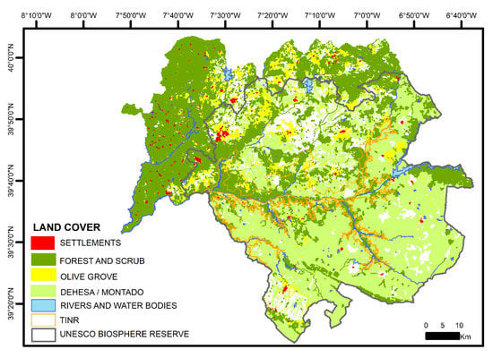 - “Agro-silvopastoral systems” (Dehesa/Montado): that occupies 68% of the TINR. The dominant species of trees are cork oak (Quercus suber, L.), holm oak (Quercus ilex, spp. Rotundilfolia, L.), shrubs and pastures. Traditionally this system is exploited by multiple land uses, combining the exploitation of tree cover, both cork and wood for charcoal, and a rotation of grazing, cultivation and fallow in the undercover and forage for the cattle, sheep and Iberian pig [64]. This system secures important social functions for the local population as it is used by hunters, beekeepers, and mushroom pickers, as well recreational and relaxing functions due to the natural characteristics that allows for multiple active tourist activities [20,65].