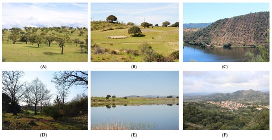 During 2019, fieldwork was conducted to collect representative photographs of each of the landscape typologies (Figure 4), and which take the following designations: (A) Dehesa/Montado; (B)-Dehesa/Montado with stockbreeding; (C)“Traditional olive grove”; (D) “Forest and scrub”; (E) “Rivers and water bodies”; and (F)“Rural settlements”. The selection of photographs used in the questionnaire was made with the support of local stakeholders’ opinions (N = 9) who identified the photographs of each of the landscape typologies that characterize the territory.