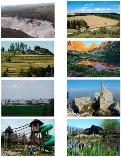 Landscape type and subtypes in Slovakia (Industrial mining landscape—Dolný Lopašov, 2020, Author: J. Špulerová; rural, agricultural landscape—Dolný Lopašov, 2020, Author: J. Špulerová; extensively used forest-agricultural landscape—Detvianske lazy, 2015, Author: J. Špulerová; natural mountain landscape—High Tatras, 2021, Author: V. Piscová; new constructed suburban area—Trnava region, 2017, Author: Z. Izakovičová; cultural monuments—Plavečské Podhradie, 2012, Author: J. Špulerová; amusement park—Zoo Park Bratislava, 2021, Author: J. Špulerová; historic landscape with watermills—Tomášikovo, 2008, Author: J. Špulerová).