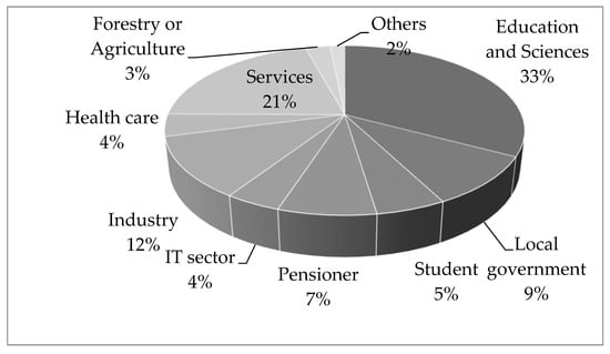 A total of 189 respondents participated in the sociological research. Women had a slight predominance, accounting for 57.6% of participants. In terms of age the dominant group was the population aged 40–60, who represented up to more than half of the respondents. The involvement of young people was lower, with a participation rate of 18.25%. According to the level of education, university-educated respondents predominated in the sociological survey (80.9% of all respondents). The increased representation of this age group could also be caused by the form of questionnaire distribution. The low proportion of participants with primary education (1.7%) might be due to the fact that these residents have lower computer skills and often limited access to the internet, where the questionnaire was available for participation. Due to an unrepresentative sample, primary and secondary education were merged in further analyzes. In terms of the employment structure (Figure 2), most respondents were employed in education and science, which makes sense, as these respondents are significantly concerned with the issue. People working in services and local government offices, for whom the landscape typology is important both in terms of attractiveness and in terms of management/protection of these valuable landscape structures, also had the significant representation.
