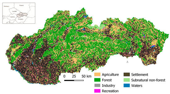 Slovakia is a small but relatively diversified country. The total area is 49,034 km2. The population is 5,460,136 [26], of which 48.8% are men and 51.2% are women. The population density is 111.2 inhabitants/km2. Slovakia is made up of two basic geomorphologic units belonging to the Alpine–Himalayan system: the Carpathians and the Pannonia Basin. Natural conditions are a determinant of the diversity of ecosystems as well as the diversity of land uses. The agricultural land dominates in the landscape structure with a share of 48.5%, of which 59.17% is cultivated. Cereals are grown in particular, and the share of energy crops has been rising in recent years due to their favorable market conditions. Permanent grasslands occupy 35.8% of the area of agricultural land in the Slovak Republic, the rest are permanent crops—orchards, gardens and vineyards. The second most significant element of the landscape structure is forests, which account for 41.3% of Slovakia’s area.