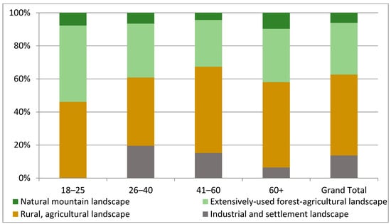 The results of our questionnaire survey show that 47.1% of respondents considered rural and agricultural landscape to be a characteristic Slovak landscape (Figure 4). A total of 30.1% of respondents perceived the extensively used forest and agricultural landscape, including semi-natural non-forest habitats such as scrubland, meadows, pastures, wetlands and rocks to be characteristic. A total of 5.8% of respondents perceived the natural mountain landscape as characteristic, and a relatively high proportion of respondents (13.2%) voted for the industrial and urbanized land as a representative type of Slovakia, which may be due to the rapidly growing, developing industrial production in the post-transformation period.