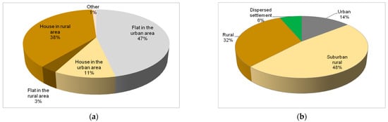 The respondents living in a family house, whether in an urban or rural settlement, slightly predominated (Figure 5a). In terms of housing, the respondents preferred housing in rural areas, preferably in suburban rural settlements (Figure 5b), which began to develop significantly after the transformation. On the one hand, residents preferred living close to nature, and on the other hand, they wanted certain comforts—easy access to work, close availability to services, etc. This makes the suburban rural settlements the most attractive. Housing in dispersed settlements, which are more distant and more difficult to access, was less preferred. These locations are more interesting for seasonal living or recreation. Many dwellings in these localities have recently changed into cottages and weekend houses [30]. Only 14.3% of respondents preferred living in cities.