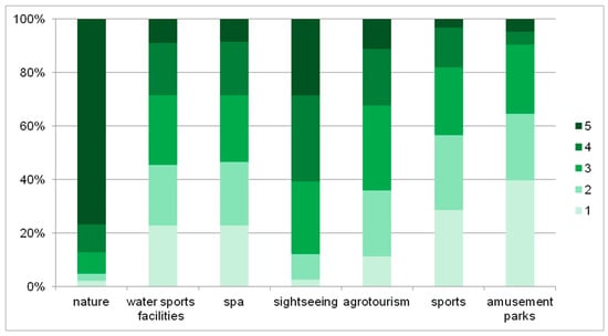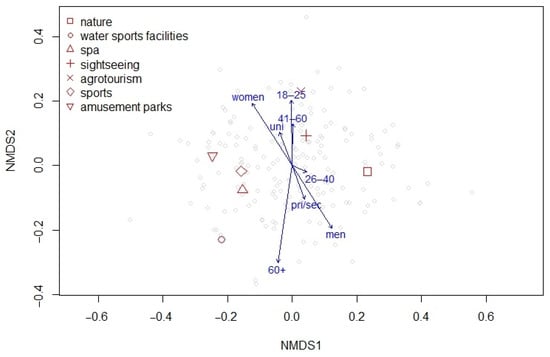 Respondents clearly identified natural landscape types as the most attractive type for recreation; more than 90% of respondents’ assigned them third and higher levels of significance (Figure 6). In terms of recreational opportunities, the respondents also highly rated the landscape with the occurrence of cultural monuments or rural landscape types suitable for agro-tourism. Surprisingly, the respondents assigned the lowest value in terms of recreational use to land with modern attractions, such as water parks, golf courses, etc., which negatively affect the landscape scenery. This observation is probably conditioned by the sample of respondents, as the middle class of society was mostly involved in the survey, and there was little interest in survey participation from respondents in the business sector. The results of multidimensional scaling showed a strong relationship between young women (age 18–25) and a preference towards recreation for agro-tourism. The middle generation (age 41–60) with university education was looking more frequently for cultural monuments (Figure 7).