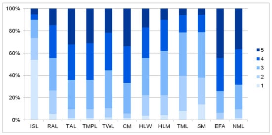 Which types of landscape do you find the most endangered/degraded? (Legend: 5—Under the greatest threat, 1—Under the least threat; landscape subtypes: ISL—Industrial and settlement landscape; RAL—Rural, agricultural landscape; TAL—Traditional agricultural landscape; TMPL—Traditional meadow and pasture landscape; TWL—Traditional wine-growing landscape; CM—Cultural monuments in settlements; HLW—Historic landscape with watermills; HLM—Historical landscape of mixed type; TML—Traditional mining landscape; SM—Sacred monuments; EFA—Extensively used forest-agricultural landscape; NML—Natural mountain landscape).