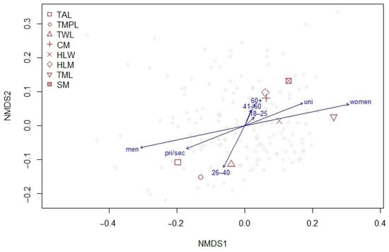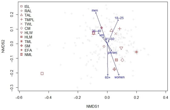 Multidimensional scaling of respondent perceptions of landscape that they find the most endangered/degraded (Variability and preferences of respondents: uni—university education; pri/sec—primary and secondary education; Gender: women, men; Age categories: 18–25; 26–40, 41–60, 60+; Landscape types: ISL—Industrial and settlement landscape; RAL—Rural, agricultural landscape; TAL—Traditional agricultural landscape; TMPL—Traditional meadow and pasture landscape; TWL—Traditional wine-growing landscape; CM—Cultural monuments in settlements; HLW—Historic landscape with watermills; HLM—Historical landscape of mixed type; TML—Traditional mining landscape; SM—Sacred monuments; EFA—Extensively used forest and agricultural landscape; NML—Natural mountain landscape).