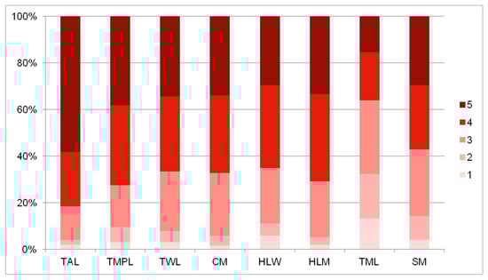The need for landscape protection—Which types of biocultural landscape do you find the most endangered/degraded and in need of the most protection? (Legend: 5—the highest protection needed, 1—the least protection needed. Biocultural landscape subtypes: TAL—Traditional agricultural landscape; TMPL—Traditional meadow and pasture landscape; TWL—Traditional wine-growing landscape; CM—Cultural monuments in settlements; HLW—Historic landscape with watermills; HLM—Historical landscape of mixed type; TML—Traditional mining landscape; SM—Sacred monuments).