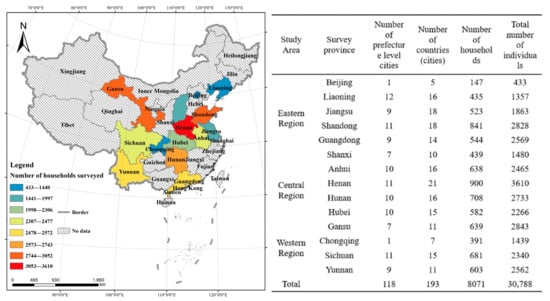 The data used in this paper were obtained from the China Household Income Projects 2013, released by the China Income Distribution Research Institute. The CHIP2013 data were the fifth round of national survey data obtained by the National Household Survey Office of Urban–Rural Integration of the National Bureau of Statistics in 2014, which was the latest source of publicly released data [64]. The data took mainland China as the research area, and sampling methods were used to determine the specific research area. After sampling and sorting, the sample distribution area covered 14 provinces (municipalities directly under Central Government control) and 193 districts/counties in eastern, central and western China. After sorting, the effective sample was 8071 rural households and 30,788 individual samples, mainly involving the personal information of family members, agricultural business status and family income and expenditure. The resource endowment, economic and social status and the sample distribution area itself differed greatly and were strongly representative, which was helpful for analyzing the influencing factors of the degree of cropland abandonment in China at the farmer and district/county levels.