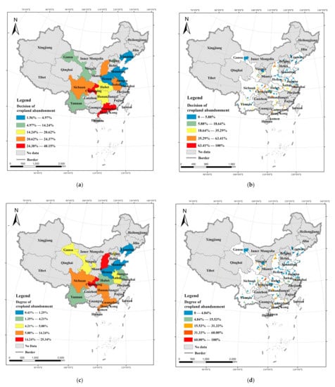 Figure 2. Cropland abandonment levels and spatial distribution map of degrees of abandonment. (a) The picture shows the proportion of farmer households in the sampled provinces who made the decision to abandon their cropland. (b) The picture shows the proportion of farmer households in the sampled districts/counties who made the decision to abandon their cropland. (c) The picture describes the degree of cropland abandonment at the provincial level based on sampling data. (d) The picture describes the degree of cropland abandonment at the district/county level based on sampling data.