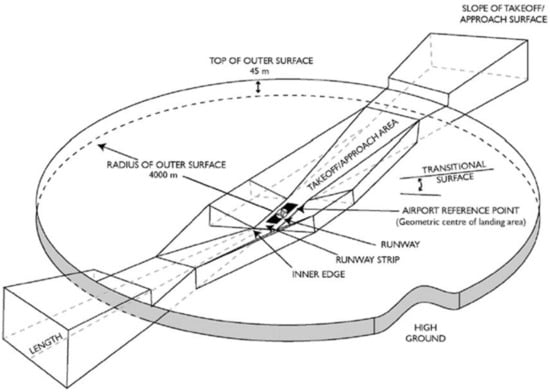 Restrictions on the height of constructions, applying in the vicinity of airports, or physical object height restrictions applied in the areas surrounding airports, as well as volumetric requirements within the area of an airport, are imposed, to ensure safe take-off and landing of air vehicles. The International Civil Aviation Organisation (ICAO) has developed standards and recommended practices defining restriction zones or height limitations, while research towards generation of 3D electronic Terrain and Obstacle Databases (eTODs) is conducted by exploiting the variety of data acquisition techniques. Requirements for airspace around aerodromes, free from obstacles, are stipulated in ICAO documentation. Obstacles are defined as “All fixed (whether temporary or permanent) and mobile objects, or parts thereof, that: (a) are located on an area intended for the surface movement of aircraft; or (b) extend above a defined surface intended to protect aircraft in flight; or (c) stand outside those defined surfaces and that have been assessed as being a hazard to air navigation” [45]. The allowed volume of obstacles is delineated by Obstacle Limitation Surfaces (OLSs). According to ICAO, OLSs are “conceptual (imaginary) surfaces associated with a runway, which identify the lower limits of the aerodrome airspace above which objects become obstacles to aircraft operations” [46]. The ICAO [47] distinguishes the following types of OLS, also shown in Figure 1:
