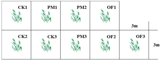 Three treatment groups were set up in the field experiment, which were control tests (CK), pig-manure treatment tests (PM), and organic-fertilizer treatment tests (OF). Each group was set up with three parallel plots, and each plot covered an area of 9 m2 (3 m × 3 m). In order to avoid mutual interference between plots, 0.5 mm-thick impermeable membrane was used to block each plot, and the buried depth of impermeable membrane was 40 cm. A 20 cm-wide footpath was set between each plot site for on-site monitoring and sample collection (Figure 1, Figure S1 in Supplementary Materials).