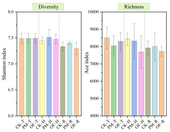 Shannon and ACE indexes were calculated to estimate soil microbial diversity and richness of each sample. As shown in Figure 2, at tillering stage, there were no significant differences in Shannon index among the three groups. At heading and ripening stages, PM tests had the highest Shannon index; they were 7.404, 7.366, and 7.297 in the PM, CK, and OF tests in the ripening stage, respectively. Similar to our study, the application of pig manure could increase the microbial diversity in rice-wheat cropping soil []. Overall, the application of both PM and OF improved the soil microbial diversity in the paddy field, but the improvement of Shannon index in both of them was not significant in the whole growth cycle of rice growth. As for the microbial richness, there was little difference among each treatment tests in the growth cycle of rice. At the tillering stage, the soil microbial richness of CK tests was the highest (8499.759), followed by OF tests (8299.435) and PM tests (8042.083). At the heading stage, the order of the microbial richness was CK > PM > OF. Finally, at the ripening stage, the ACE index of PM tests was the highest, while it was the lowest in OF tests. From the perspective of the whole growth cycle of rice, the application of PM increased the richness of soil microbial community, while OF had a negative effect. This might be because the higher organic matter content in PM provided many nutrients for the growth of microorganisms, which was conducive to microbial reproduction and results in higher soil microbial biomass, while organic manure contains vast quantities of readily utilizable energy sources [].