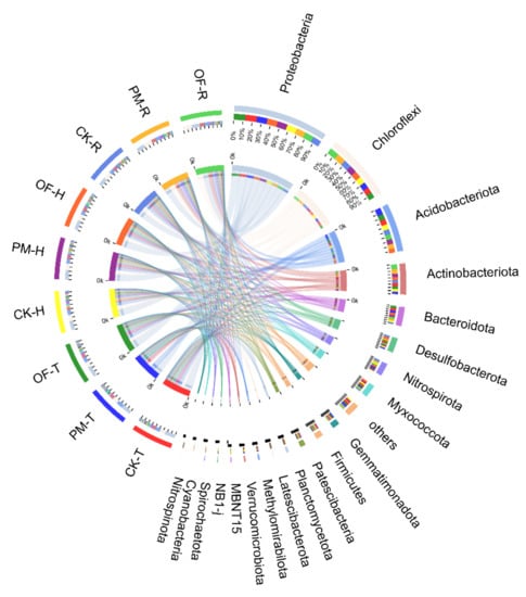 The microbial composition of paddy soil at phylum and genus levels under different manure treatments is shown in Figure 3. The relationship between samples and phyla is shown in a circos diagram (Figure 3a), and the relative abundance below 1% was merged to others. The dominant phyla across all samples were Proteobacteria, Chloroflexi, Actinobacteriota, Bacteroidota, Desulfobacterota, Nitrospirota, and Myxococcota. The relative abundance of Proteobacteria in different treatment tests was the highest, which was in accordance with previous studies. Ye found that Proteobacteria was the dominant bacteria in corn-field soil []. It was known that Proteobacteria can participate in the biological cycle of essential mineral nutrients in the soil; the high proportion of Proteobacteria in rhizosphere soil is beneficial to the maintenance of fertility and plant growth []. The relative abundance of Chloroflexi increased with the growth of rice. Most of the microorganisms in Chloroflexi were strictly anaerobic bacteria, which could ferment sugars and polysaccharides into organic acids and hydrogen [], thus accelerating the decomposition of organic matter in paddy soil. The relative abundance of Actinobacteriota in fertilization tests was higher than that in the control at ripening stage. It was clearly demonstrated that the increase in the relative abundance of actinomycetes after the application of manure may be detrimental to the accumulation of soil organic matter []. This was in accordance with the concentrations of higher soil organic matters for OF and PM treatments shown in Table 2. The relative abundance of Nitrospinota among different treatment groups increased with the growth of rice, which was important as bacteria participated in nitrogen cycle in paddy soil [].
