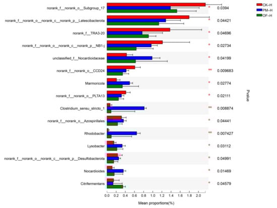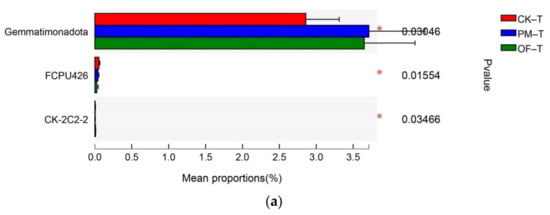 One-way ANOVA was further used to analyze the significant differential bacteria between treatment groups based on the relative abundance at phylum and genus levels. Among the phyla or genera of the top-fifteen abundances, the phyla and genera with significant differences between groups were selected to display. At the phylum level, Gemmatimonadota had significant difference among all samples during tillering stage (p < 0.05). The relative abundance of Gemmatimonadota in PM and OF tests were significantly higher than that in CK tests by 29.87% and 27.70%, respectively (Figure 4a). It was shown that the soil amendments increased C concentrations (labile and stable fractions), improved soil physicochemical properties, and had positive associations with Gemmatimonadota bacterial groups []. Latescibacterota showed significant differences among different treatments, with the highest abundance during heading stage. The relative abundance of Latescibacterota in the control was significantly higher than that in PM and OF tests at heading stage (p < 0.05), which were 42.10% and 60.36% higher, respectively (Figure 4b). With the growth of rice, significant difference in Actinobacteriota was observed at the ripening stage. The relative abundance of Actinobacteriota in the fertilization group was significantly higher than that in the CK group (p < 0.01), and they were 53.91% and 46.49% higher in OF and PM tests than that in the CK group (Figure 4c). In addition, the relative abundance of Desulfobacterota in the CK group was 34.17% and 41.57% higher than that in the PM and OF groups, respectively, while the relative abundance of Nitrospinota in the CK group was significantly higher than that in the PM and OF groups (63.36% and 94.19% higher). This might be because the sulfur cycle was linked with the anaerobic oxidation of methane and the nitrogen cycle, which included the oxidation of ammonium to nitrate in the oxic zone and denitrification coupled to the oxidation of sulfide []. Overall, Gemmatimonadota, Latescibacterota, Actinobacteriota, Desulfobacterota, and Nitrospinota could be regarded as the significant differential phyla with high abundance after different fertilization treatment. As for the analysis on genus level, it could be seen from Figure S2 that Thermodesulfovibrionia was the most abundant genus with significant difference at tillering and ripening stages. The relative abundance of Thermodesulfovibrionia in PM and OF tests was 53.86% and 40.90% higher than that in CK tests at tillering stage (p < 0.05), while it was the highest (p < 0.05) in the CK tests at ripening stage, which was 25.65% and 49.70% higher than that in PM and OF tests. During the stage of heading, Clostridium_sensu_stricto_1 and Rhodobacter were the most differential bacteria, which were significantly higher in PM tests (Figure 5). They were pathogenic bacteria related to several diseases such as difficile [], which may cause a certain stress on soil health. However, after the composting of pig manure into organic fertilizer, a large number of pathogenic bacteria were reduced, thus alleviating the effect on soil health with fertilizer.