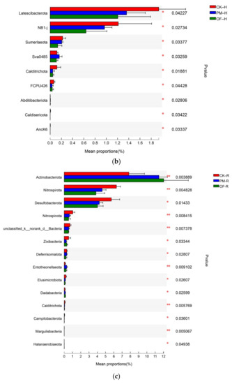 The comparison of differential bacteria between treatment tests based on the relative abundance at phylum level (a) tillering stage; (b) heading stage; (c) ripening stage (* p < 0.05; ** p < 0.01; *** p < 0.001).
