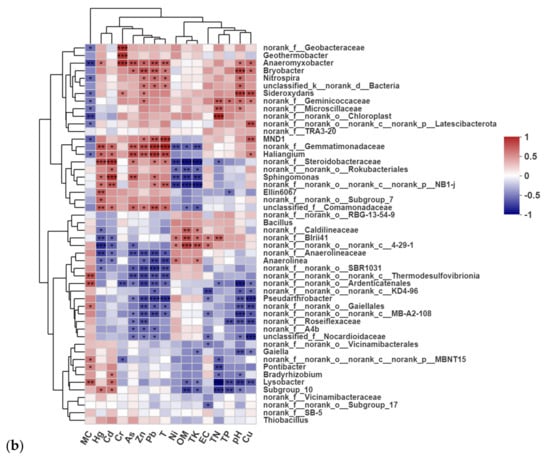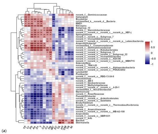 Moreover, the influences of environmental factors on individual microorganisms were further analyzed. Spearman coefficient was calculated to study the correlations between environmental factors and microorganisms on genus level, and the heatmaps of different treatments are shown in Figure 7 and Figure S3. In the control tests, only a part of the microorganisms was correlated to the environmental factors. It could be seen from Figure S3 that Geothermobacter, Pseudomonas, Steroidobacteraceae, and Anaeromyxobacter were significantly negatively correlated with OM, indicating that high concentration of organic matter was not conducive to their growth. Thermodesulfovibrionia was positively correlated with TP and TN (p < 0.01), while it was significantly negatively correlated with heavy metals such as Zn, Pb, As, Hg, and Cd, and temperature. As the most differential genus which has been described in the previous section, Thermodesulfovibrionia was greatly affected by the change in above parameters with different manure applications. In addition, Pseudarthrobacter was negatively correlated with Zn, Pb, and pH, and positively correlated with TP and MC at different stages. Nitrospira was only negatively correlated with Cr (p < 0.01). As seen in Figure 7a, more correlation efficiencies were observed in the PM tests compared with the control, and the heavy metals were more influential than conventional indicators. That may be because the soil after PM application contained more heavy metals (Table 1), resulting in great effect on microorganisms. In the PM tests, Bacillus and Skermanella were significantly positive correlated with TK and pH. That was because they contain alkalophilic bacteria strains []. In addition, Bryobacter and Nitrospira were positively correlated with TP, Cr, Pb, As, and Zn in PM tests. Lysobacter and Pontibacter were significantly negatively correlated with Cr, Tk, and Ni. In the OF tests, most abundant genera had significant correlation with the environmental factors (Figure 7b). For example, Anaeromyxobacter was negatively correlated with MC, and positively correlated with Hg, Cr, As, Zn, Pb, pH, and Cu. Bryobacter was positively correlated with As, Zn, Pb, pH, and Cu, and Sideroxydans was also positively correlated with Cr, Zn, pH, and Cu. It was concluded that the response of soil microorganisms to fertilizer applications depends strongly on environmental factors and may vary considerably among study sites. The organic matters and nutrients can provide sufficient substrates for the soil microorganisms, therefore accelerating their reflecting to the environmental factors. However, our analysis on soil bacterial function was not sufficient; more specifically, designed experiments are needed to enhance the understanding of bacterial function in fertilized soils. Moreover, with the growth of rice, the microbial composition became more different among the three tests. The results showed that there were significant fertilizer and time interaction effects, which were the same results as other studies []. Hence, long-term tests and larger-scale field experiments are needed to enhance the understanding of microbial structure in fertilized paddy soil. Furthermore, environmental factors that had significant influence microorganisms were further analyzed.