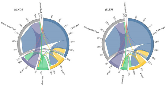 In an urban agglomeration, agricultural area, forest areas, grass, water area, and unoccupied land are all expected to shrink by 361, 599, 438, 488, and 20 km2 by 2030, respectively, under the natural outcome measurement (NDS in Figure 3). Conversely, construction land area has a projected increase of 25.52%. According to the direction of land-use area transfer (Figure 3), arable land, grassland, and water area will mainly be converted to construction land, whereas forest land and unused land will be evenly transferred to other land types. Although the change range of construction land is the largest, it seldom changes to other land types, and its increase mainly results from the transfer of large areas of cultivated land.
