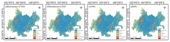 Land-use data from 2010 and 2020 were used as examples to simulate changes in land use based on Markov’s predictions for every land-use level in 2020. The results were then compared to the actual values for 2020 to assess the PLUS model’s simulation accuracy (Figure 4). The method was employed to determine the reliability overall and the kappa coefficient. Values and the kappa coefficient that are near 1 denote simulation accuracy that is higher. The simulated performance of the model reaches a sufficient level in statistical significance whenever the kappa coefficient is higher than 0.75 [44]. The accuracy of kappa was confirmed to be 0.83.