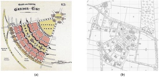 Similarities in plans between the garden city diagram and the plan of a mental asylum of the early 20th century: (a) Diagram No. 3 by Ebenezer Howard showing the ward and centre of the garden city (from Howard, Ebenezer, To-morrow: A Peaceful Path to Real Reform, London: Swan Sonnenschein & Co., Ltd., 1898; source: [10] public domain, (b) The plan of the Kingseat Asylum in Scotland, built from 1900 to 1904, as pictured on the Ordnance Survey Map from 1944; source: the collection of the National Library of Scotland, CC-BY (NLS).