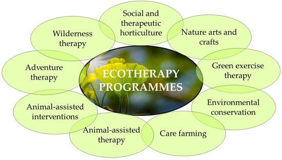 Ecotherapy is often defined as therapeutic treatment consisting of regular structured activity, led by trained professionals, taking place in a green environment, focused on performing an activity, and relating to exploration and appreciation of nature in its various forms and aspects. It often involves social contacts generated by spending this time with other people, although the interactions are never forced. It includes a few main groups of programmes (see Figure 2), such as: