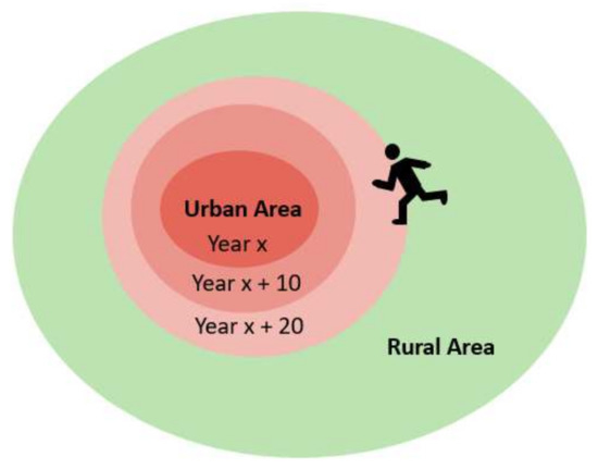 While the term urbanization draws attention primarily to growing cities, Brenner and Schmidt propose the concept of extended urbanization [14] to focus on the interconnectedness of urban and rural spaces. Rural–urban migration connects cities and rural spaces functionally, and is the main driver of urbanization in many regional contexts [15]. At this point, it is necessary to distinguish between urban population growth and urbanization. Urbanization describes the (globally growing) share of urban versus rural population. However, urban population growth can also take place without urbanization if there is equal natural population growth in rural and urban areas [15,16]. While some studies suggest that urbanization and rural out-migration might reduce land use pressures in rural areas [17,18], the concept of extended urbanization assumes an increasing operationalization of rural areas for urban purposes, that is, landscapes far from urban centers are operationalized (e.g., for food production, other ecosystem services or energy production) and constitutive for urban growth [2,19,20,21].