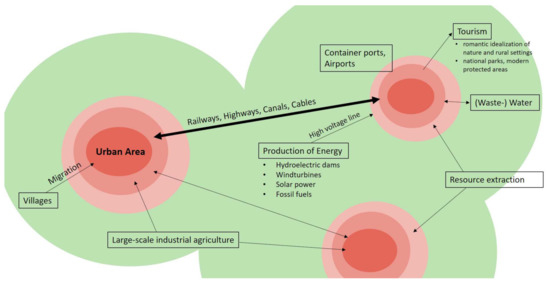 Third, extended urbanization involves changes in access to land and opportunities for land use, for example, through changes in tenure. Brenner and Schmid refer to this as “enclosure of land from established social uses in favor of privatized, exclusionary and profit-oriented modes of appropriation, whether for resource extraction, agro-business, logistics functions or otherwise” [14]. The following two figures (Figure 1 and Figure 2) illustrate the concept of extended urbanization. The keyword urbanization usually refers to processes related to the growth of cities. Extended urbanization helps to focus on the connections and interdependencies between urban and rural change processes.