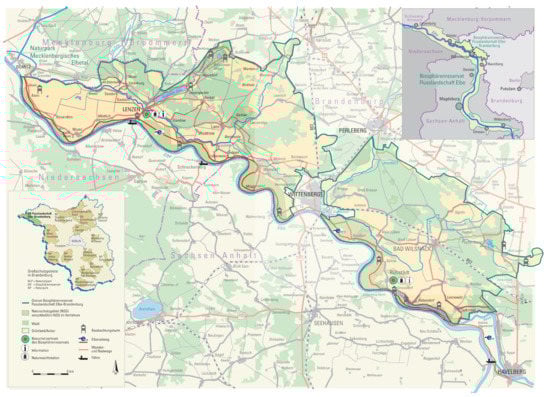 - Trägerverbund Burg Lenzen, e.V. Karte Flusslandschaft Elbe Brandenburg. Available online: https://www.burg-lenzen.de/burg_lenzen/upload/6_service/2_download_pdf/Karte_Flusslandschaft_Elbe_Brandenburg.pdf (accessed on 16 September 2022).