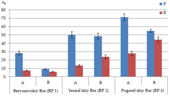 | Pogorel’skiy Bor | 1 | 7.0 ± 1.3 3.0 ± 0.9 | - | 74.0 ± 3.9 31.8 ± 2.5 | - | sp. | 63.0 ± 4.3 31.0 ± 2.8 | - | - | 50.0 ± 3.3 39.0 ± 2.6 |