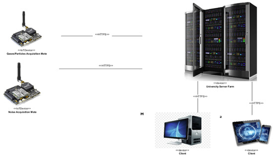 The environmental IoT sensor was divided into two layers: the hardware layer and the software layer. The hardware layer is based on the Libelium’s Plug & Sense! line of products [57]. These are commercially available, tested, and calibrated environmental monitoring devices. The devices encapsulate a programmable Arduino-based microcontroller board in a waterproof and weatherproof plastic enclosure. All the sensor probes plug into the enclosure via a nine-pin waterproof connector, which facilitates initial deployments and future replacements. Figure 2 depicts the physical and virtual nodes in the system, along with their links and corresponding internal software components.