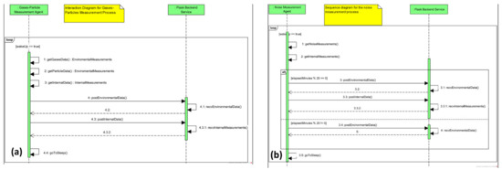 Sequence diagram between the OD platform and the IoT devices: (a) air quality IoT device; (b) noise IoT devices.