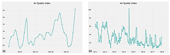 The third part of the dashboard graphs the Air Quality Index along with the different contaminants according to the parameters selected by the user. All the graphs automatically update as a user changes any of the parameters. As an example, Figure 5a shows a time series of daily aggregate AQI from one point for December 2020, and Figure 5b shows a time series of hourly aggregate AQI from one point for the first seven days of January 2021.