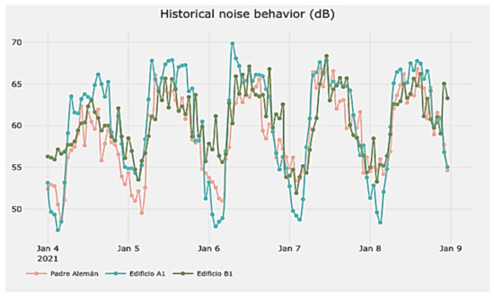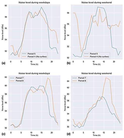 When the curfew time changed, a similar behavior was observed. Figure 9c,d show a comparison between periods 7 and 8. Period 8 has a more relaxed curfew by adding two hours for commercial and social activities. At the same location, the noise data clearly reflect how the new curfew prolonged the operating hours of the nearby businesses. This shows that using the platform behavioral changes of citizens can be monitored and analyzed, creating a valuable tool for a community when creating policies or studying the implication of a policy.