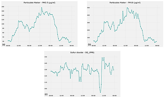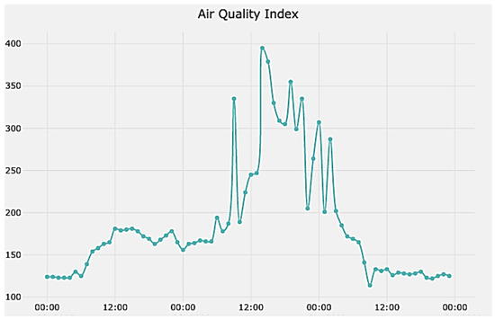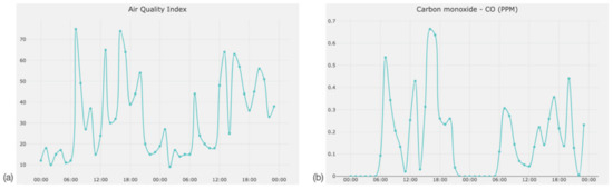 The Air Quality Dashboard was divided into three parts. The first part presents the last measured variables, using a gauge to represent the current air pollution level following the Air Quality Index (AQI) algorithm. This graph is followed by the current values of particulate matter at 1, 2.5 and 10 μm and the concentration of carbon monoxide, nitrogen dioxide, ozone and sulfur dioxide at ground level, as shown in Figure 4.