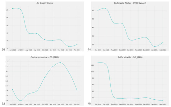 In Santo Domingo, the level of air quality improved as the curfew was extended throughout the COVID-19 pandemic, as shown in Figure 10a. Comparing the different pollutants, we can see that the high levels of air quality index were due to dust particles (Figure 10b) in the first three months of the study and, in the latest month, were driven by carbon monoxide and nitrogen dioxide concentrations, as shown in Figure 10c,d.