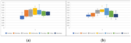 A further analysis of the behavior of carbon monoxide, a gas related to motor vehicle activities, during each day of the week shows an increase between periods 10 and 12. However, on average, the most contaminated weekday does change throughout all periods. In Figure 13a, the carbon monoxide averages reach the highest value during all measured Wednesdays. However, the highest variation is observed on Thursdays. The latter may signal that the average contamination on this weekday could have occurred in short bursts in which carbon monoxide levels rapidly rose and fell. This behavior was also observed, albeit in a less dramatic manner, on the measures taken over on Mondays.