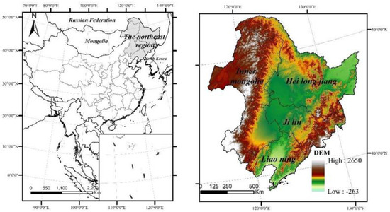Northeast China (115°E–135°E, 38°N–56°N) includes Liaoning Province, Jilin Province, Heilongjiang Province, Chifeng League, Tongliao League, Xing’an League, and Hulunbuir in eastern Inner Mongolia Autonomous Region. The Northeast region (Figure 1) has the largest plain in China of fertile black soil, and is in the three largest black soil regions in the world, which is very suitable for agricultural production. Northeast China is the largest commercial grain base in China. In 2020, the grain output was 17,346.88 tons, accounting for 25.91% of the country’s total grain output. About 1/3 of the grain was transferred to other provinces. In addition, the Northeast region is also an old-fashioned industrial base in China, with a high level of urbanization and a serious loss of rural population. Compared to 2010, the rural population in Northeast China lost 14.56 million, and the population aging rate was 19.30%, which was 7.05% higher than in 2010 and 13.08% higher than in 2000. The population aging is worsening.