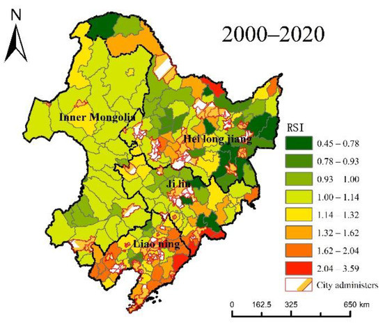 The area of rural settlements in Northeast China showed a significant increase from 2000 to 2020. The area increased by a total of 190,603.03 hectares, or 7.62%, over 20 years. There are 129 counties and cities (70.88%) with RSI values greater than 1, indicating an increase in the area of rural settlements. Seventy-one counties and cities (39.01) have RSI values greater than 1.14, indicating a large increase in the area of rural settlements. Eight counties and cities have RSI values greater than 2, indicating a doubling of the area of rural settlements. The RSI (Figure 2) values in the eastern and southwestern parts of the Liaohe Plain and the central part of the Sonnet Plain are larger, and the area of rural settlements has expanded significantly. The RSI values in the western part of the Northeast Plain are between 0.93 and 1.14, with relatively small changes, and the rural settlements are stable. The eastern part of the San Jiang Plain has the lowest RSI value, and the area of rural settlements has decreased considerably; the northern part of the Sonnet Plain has a lower RSI value, and the area of rural settlements has decreased slightly.