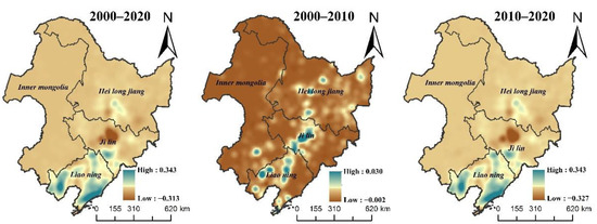 From 2000 to 2020, the density values (Figure 3) in some areas changed slightly, and the remaining areas were basically unchanged. The area of rural settlements in the Northeast Plain increased slightly, while the area of rural settlements in most areas decreased slightly, and the maximum decrease in nuclear density was only 0.02/km2. The core density value of rural settlements in the central and western regions decreased, the maximum value of the decrease in the core density was 0.327/km2, and the reduction rate of rural settlements increased. The core density value of rural settlements in the southeast region increased, and the area of rural settlements increased.