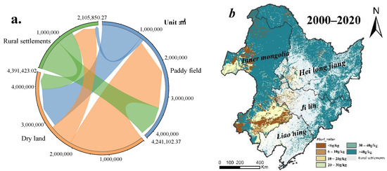 Northeast China is China’s commodity grain production base, which has important economic value and strategic significance. During the COVID-19 outbreak, some developing countries that need to rely on external resources to ensure national food security have faced enormous pressure [41]. The continuous expansion of urban and rural construction land in China has put a lot of pressure on maintaining the red line of arable land [36]. The proportion of cultivated land occupied in the expansion of rural settlements in China is 60% [42]. However, the problem of the loss of high-quality arable land due to the expansion of rural settlements has not been clarified. The organic matter content of cultivated land occupied by the expansion of rural settlements in Northeast China from 2000 to 2020 is high, and the disorderly expansion of rural settlements will lead to the fragmentation of cultivated land patches. The main reasons may be: (i) Both high-quality cultivated land and rural settlements in Northeast China are distributed in plain areas, and surrounding rural settlements are mostly high-quality cultivated land with high soil organic matter content; (ii) The landscape of rural settlements in Northeast China is greatly disturbed by human activities, and the expansion of rural settlements is in a disordered state, which results in more fragmented rural patches and hinders the large-scale operation of cultivated land. According to the preliminary estimates of the results of this study, the expansion of rural settlements in Northeast China caused about 39 million kilograms of food production losses, and the changes in rural settlements affected national food production.