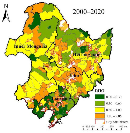 From 2000 to 2020, the rural population agglomeration in Northeast China has reduced, the rural population was drained seriously, and the utilization efficiency of the homestead was low. There are 141 (77.47%) counties in the Northeast with RHO (Figure 7) lower than the 1103 (56.59%) counties (cities) whose RHO is lower than 0.75. The spatial distribution pattern of RHO is high in the center and low in the south and north. Low RHO values appeared in the northern Songnen Plain, the eastern Sanjiang Plain, and the southwestern and eastern Liaohe Plain. The RHO value around the city is relatively high, driven by the radiation of the city, so the location conditions may affect the degree of hollowing out of the villages.