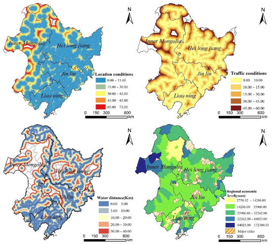 Rural settlements are influenced by a variety of factors such as natural ecology and economic technology [1]. The natural environment, traffic conditions, and economic development level affect the type and pattern of land use change in rural settlements [1,5], and the impact of economic development level is increasing [17]. Based on the distribution characteristics of rural settlements in Northeast China combined with field research, this study selects topographic conditions, location conditions, traffic conditions, water resource conditions, and county economic development levels as the main influencing factors. Topographical conditions are the basic elements that affect the distribution of rural settlements. Studies have shown that rural settlements are mostly distributed in flat areas such as plains and hills, and rural settlements in plain areas are more scattered, while rural settlements in mountainous areas are more concentrated [5]. The change in rural settlements is inseparable from the location conditions [7], the rural settlements closer to the city gave full play to the urban drive and promoted the development of rural industries [24]. This study constructs a multi-level buffer zone centered on cities and towns to measure the location conditions of rural settlements. Water resources are the basis for human production and living activities, and most of the traditional villages are built in water-rich areas such as by rivers and lakes [35]. For rural residents, water is vital to agricultural production and an important factor affecting crop yields. In recent years, the planting structure in Northeast China has changed significantly from dry land to paddy field, and the demand for water resources has further increased. Therefore, the status of water resources is one of the important factors affecting the changes in rural settlements in Northeast China. Transportation condition is regarded as the basis for promoting economic development [17,26]. Road accessibility not only plays a major role in rural settlements but also promotes the secondary development of rural settlements [24]. Road accessibility drives changes in the structure of rural settlements. In this study, main traffic lines such as railways, national highways, and provincial highways are centered, and road buffer zones are constructed to evaluate the road accessibility of rural settlements. The level of economic development of the county is expressed by GDP per capita [26]. Rural settlements with higher GDP per capita tend to have better industrial development, relatively complete support facilities, larger populations, and larger rural settlements. On this basis, a linear regression equation affecting the change of regional rural settlements was constructed.