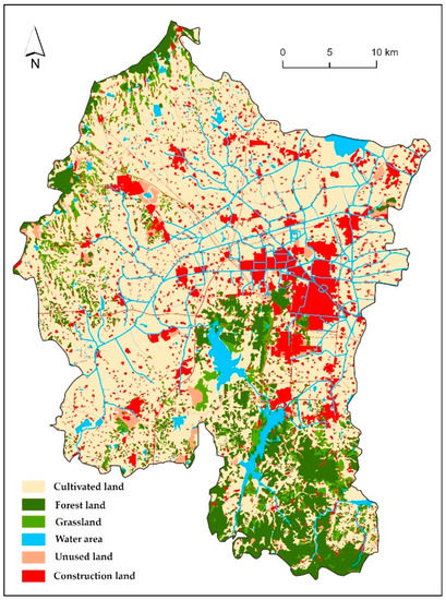 Liyang City, which belongs to Changzhou City, Jiangsu Province, is located at the junction of Jiangsu, Zhejiang, and Anhui provinces in the Yangtze River Delta, with superior location and convenient land and water transportation (Figure 1). It has a subtropical monsoon climate and is mild and humid, with abundant rainfall, sufficient sunshine, and four distinct seasons. The total area is 1535 km2, with a resident population of 785,000. The land use is as shown in Figure 2. Liyang takes all-for-one tourism as the motivation for high-quality development. The city’s “14th Five-Year Plan for Tourism Development” proposed to transform the city into a “model area of the Yangtze River Delta for high-quality tourism” and a “national demonstration city of high-end tourism economy innovation” to eventually become an “international city of good life resort destination.” With the challenges of tourism increasing in the new stage, it is necessary to adhere to the ecological redline, nurture ecological innovation, and promote the integrated protection of “landscape, forest, field, lake, and grass.”