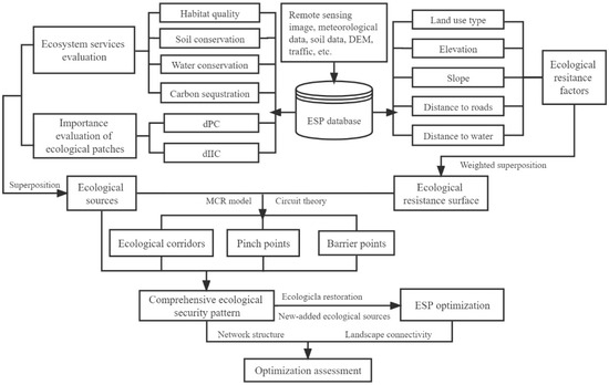 Research results of the case study show the following: (1) The optimal granularity for identifying ecological sources was 400 m, and 24 ecological sources were identified with a total area of 162.9 km2. (2) According to the leveled ecological security, the study area was divided into four zones: the core protected zone, general protected zone, coordinated-control zone, and restoration-improvement zone. (3) The current ESP includes 41 ecological corridors and 50 ecological nodes that need ecological restoration. In the optimized ESP, 31.5 km2 of ecological land were added, 3 eco-logical sources were added, 55 ecological corridors were generated, and the number of nodes in the ecological network was increased by 4. (4) The results of ESP optimization evaluation show that the landscape connectivity and ecological network structure were improved, indicating that the optimization scheme has a promoting effect on the ecological coordination of Liyang City and a spatial guiding effect on regional development.