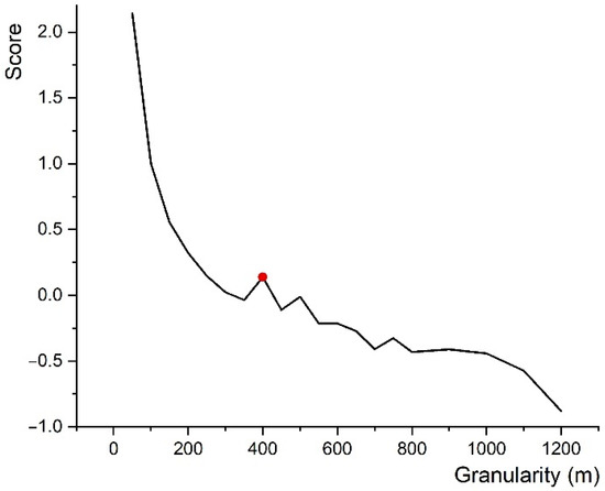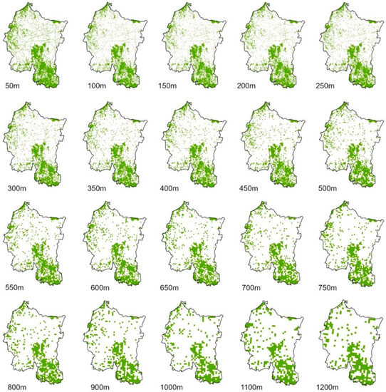 The granularity-reverse method is based on the idea of proof by contradiction in mathematics. First, it is assumed that there are different landscape-component structures under different granularity levels. Then, a series of landscape-pattern indexes is measured to reflect the structural characteristics at each granularity level. Finally, principal component analysis is carried out and the comprehensive scores of these landscape-component structures are calculated. The corresponding granularity with the highest score in a steady state is the optimal granularity [34,41]. In this paper, forest land, grassland, and water were taken as ecological land, and 20 raster images of ecological land at different granularities from 50 m to 1200 m were generated with ArcGIS (Figure 4). From the perspective of landscape wholeness and connectivity, 11 indexes were selected and calculated with FRAGSTATS (Table A1). NP (number of patches), PD (patch density), and LPI (largest patch index) are the indexes describing the landscape-composition status. LSI (landscape-shape index) is the index indicating the edge complexity of the landscape shape. The indexes analyzing the degree of landscape aggregation are PROX_MN (mean-proximity index), PLADJ (proportion of like adjacencies), CONNECT (connectance index), COHESION (patch-cohesion index), DIVISION (landscape-division index), SPLIT (splitting index), and AI (aggregation index).