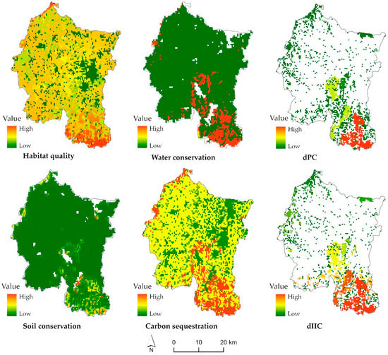Landscape connectivity is a measure of the continuity among landscape spatial-structure units [30], reflecting the extent to which landscape promotes or hinders species movement among the patches [51,52]. Higher landscape connectivity is conducive to maintaining ecological processes and biodiversity. In this study, connectivity was analyzed with Conefor2.6, which is a simple program for quantifying landscape connectivity and the importance of habitat patches for maintaining landscape connectivity through combining graphical structures and habitat-availability indexes [53]. The distance threshold was set to 1000 m and the probability of connectivity to 0.5 [54,55].