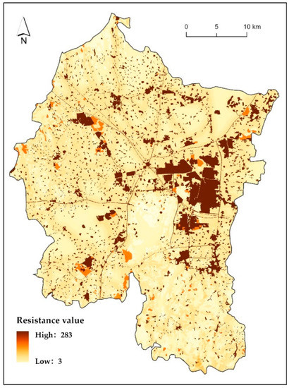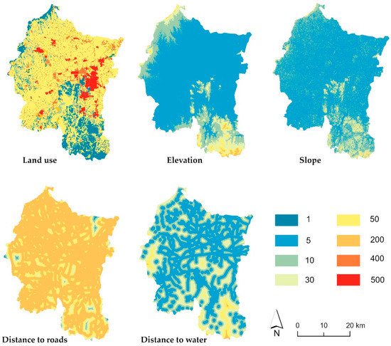 Ecological resistance refers to the degree to which species are facilitated or impeded when they are dispersed over different landscape patches [56]. The higher the value, the more difficult spatial migration and circulation will be. The ecological-resistance surface shows the spatial distribution of the regional ecological resistance and is constructed by comprehensive evaluation [57]. With reference to relevant studies [1,29,35,58,59], the natural conditions (land-use type, elevation, and slope) and human-activity factors (distance from roads and distance from waterbodies) are comprehensively considered, and five indexes were accordingly identified, as shown in Table 3. The resistance values ranged from 1 to 500. The weight of each index was determined with a hierarchical-analysis process [60].